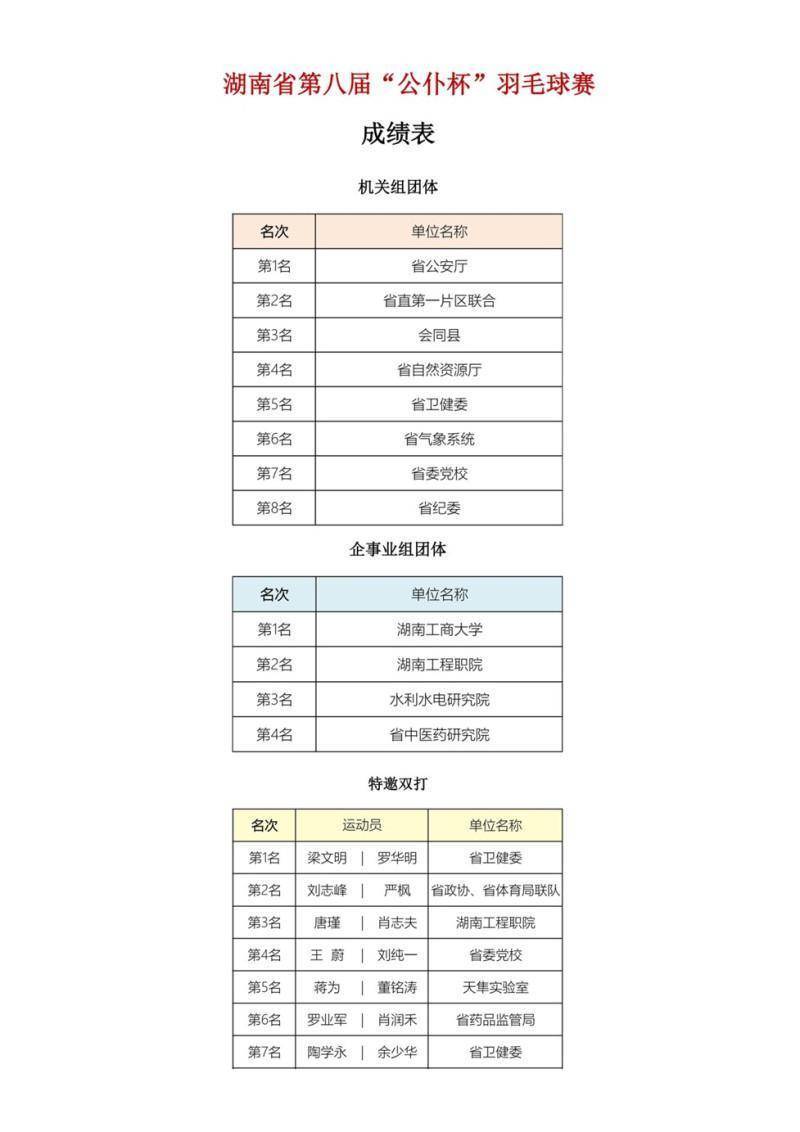 过程两天弥留热烈的角逐,30日下昼,各单项比赛成果出炉:省公安厅代表队获取机关组混杂团体冠军,湖南工商大学代表队获取企业绩组混杂团体冠军,省卫健委代表队的梁文静、罗华明组合获取特邀双打冠军。