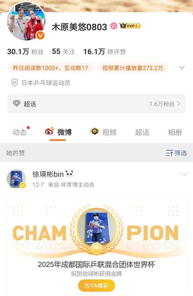 更让东谈主思不到的是,日本女队的木原好意思悠居然在微博上点赞了徐瑛彬随队获取混团天下杯的音书,许多东谈主扒出了两东谈主曾被拍到逛街的像片。木原好意思悠是个绝不守秘内心绪法的东谈主,她是陈梦的铁杆粉丝,全运会本领,她也全程道喜偶像取得好收货,并不在乎那些输给陈梦的队友们何如思。空洞来看,似乎徐瑛彬的这段跨国恋的臆想并非自取其祸。